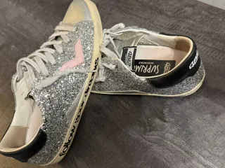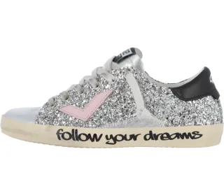 Scarpe da ginnastica da donna con un design scintillante e dettagli unici. Sneaker silver - Tomaia glitterata color argento. - Dettaglio a forma di V color rosa. - Patch posteriore in pelle nera. - Scritta follow your dreams sul lato.