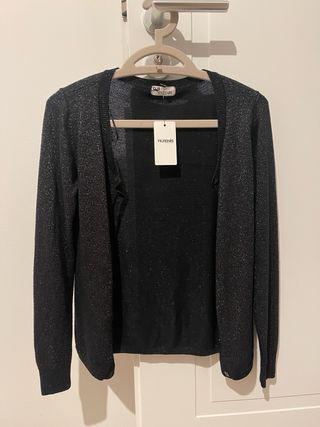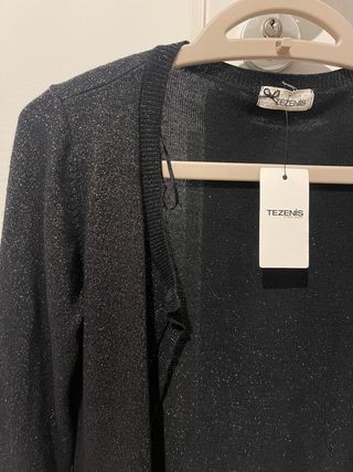 Elegante cardigan Tezenis con fili lamé dorati che creano un effetto brillantinato. - Tessuto leggero e scintillante. - Scollo a V.