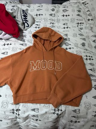 Felpa corta con cappuccio e stampa Mood sul davanti. Un capo comodo e alla moda. - Design cropped e leggermente oversize - Stampa Mood a contrasto - Cappuccio con laccetti - Maniche lunghe - Tessuto morbido