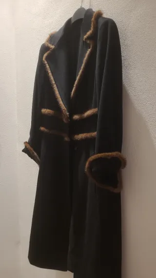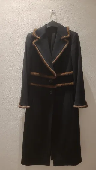 Elegante cappotto lungo con dettagli in pelliccia. - Colore nero con finiture marroni. - Collo a revers. - Chiusura con bottoni. - Polsini con pelliccia.
