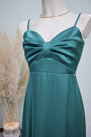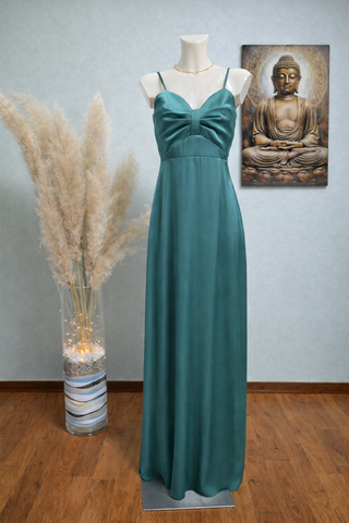 Elegante abito lungo da cerimonia o per occasioni speciali. - Tessuto satinato color petrolio. Mai indossato, ancora con etichetta. - Scollo a cuore con fiocco. - Spalline sottili. - Lunghezza maxi.