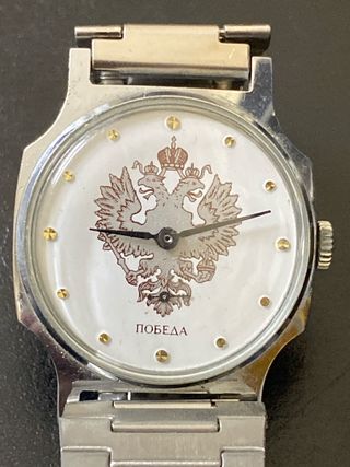 Orologio meccanico vintage URSS, marca Pobeda. Richiede revisione. - Quadrante bianco con aquila bicipite. - Scritta ПОБЕДА (Vittoria) sul quadrante. - Cassa e cinturino in metallo argentato.