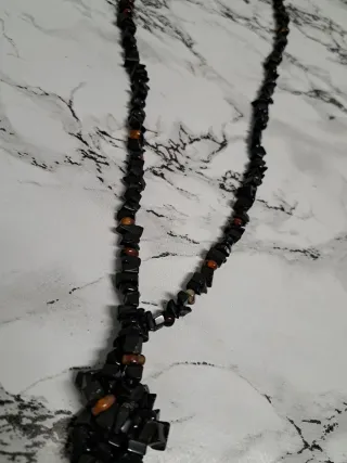 Collana con pietre naturali. Un accessorio unico che aggiunge un tocco di eleganza. Bigiotteria! - Pietre di colore nero. - Dettagli in ambra. - Design irregolare e moderno.