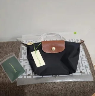 Mini borsa Longchamp con dettagli in pelle. - Colore nero con finiture marroni. - Manico superiore.