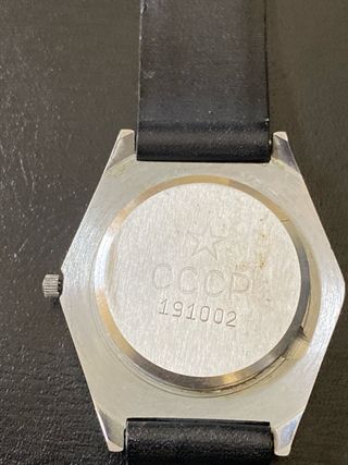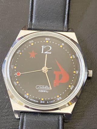 Orologio da polso Slava con movimento al quarzo, di origine sovietica. - Quadrante nero con dettagli rossi e bianchi. - Logo СЛАВА КВАРЦ sul quadrante. - Indicazione СДЕЛАНО В СССР sul bordo del quadrante.da riparare l’alberino di carica