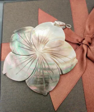 Set di due ciondoli, uno a forma di fiore e uno a forma di conchiglia. - Ciondolo a forma di fiore in madreperla. - Ciondolo a forma di conchiglia con finiture dorate.
