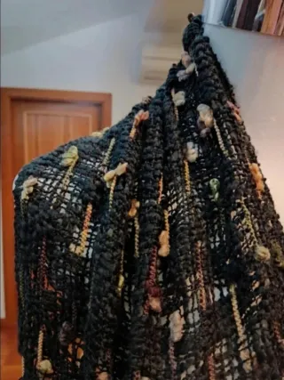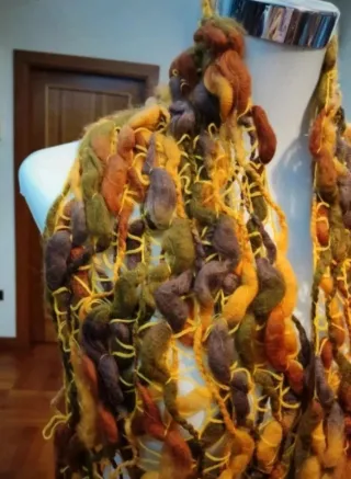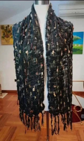 Sciarpa da donna realizzata a mano con filati misti. - Design unico e colorato. - Texture morbida e voluminosa. - Frange decorative sul fondo.