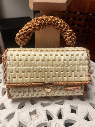 Borsa realizzata a mano con tecnica all'uncinetto, perfetta per aggiungere un tocco unico al tuo stile. - Design intrecciato con finiture dorate. - Manico rigido intrecciato. - Chiusura a scatto dorata. - Targhetta handmade applicata.