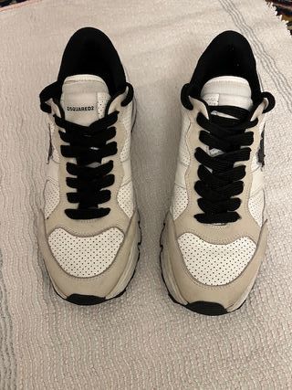 Sneakers uomo DSQUARED2 in pelle traforata. bianche/beige con stella nera sul lato . - Tomaia in pelle e camoscio. - Dettagli a contrasto. - Suola in gomma.