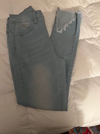 Jeans donna skinny, denim azzurro elasticizzato, finte tasche davanti, tasche vere dietro e orlo con spacchi sfrangiato - Orlo sfrangiato con strappi. - Vestibilità comoda.