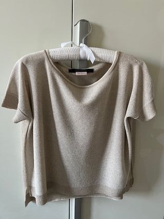 Maglia da donna con un tocco scintillante. color champagne con filato lurex / lame' color oro, modello a scatola, manica corta con polsino a costina (la misura delle spalle e' da manica a manica) Misure A 70 cm / L 53 cm - Colore beige con riflessi dorati. - Tessuto leggermente luminoso.
