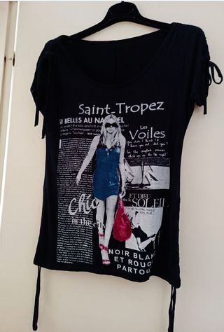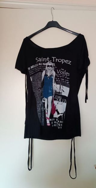Maglia blusa nera con disegno stampato trendy 95% viscosa 5% elastane,con elastici nelle maniche e nella vita per arricciarla, TG.unica veste S-M. Scollata sulle spalle, può essere portata anche con spalla scoperta di lato, fresca perché di viscosa. Info gonne,abiti, bluse clicca #lucrezialaviniasu - ✅ I miei articoli vengono lavati e igienizzati, fatte foto e video prima di spedire✅ NO SPEDIZIONI CON INPOST /MONDIAL RELAY #Camisa blusa negra con diseño moderno Saint Tropez Chic, 95% viscosa #maglia #viscosa #nero #regolabile #blusa #estivo #estate #manichecorte #nuovo #trendy