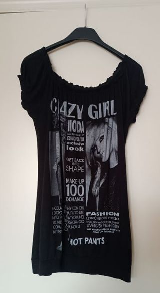Maglia blusa nera con disegno stampato trendy in chiaro scuro stile cinema,95% viscosa 5% elastane,elasticizzata e arricciata nelle maniche e nella scollatura,TG. Unica veste S-M. Decorazione scarpa con il tacco dorata in basso nella parte dietro,l'etichetta interna si è sbiadita. Scollata ed elasticizzata sulle spalle,può essere portata anche con spalle scoperte.Info bluse clicca #lucrezialaviniasu ✅ I miei articoli vengono lavati e igienizzati, fatte foto e video prima di spedire✅ NO SPEDIZIONI CON INPOST /MONDIAL RELAY #Camisa blusa negra con diseño de tendencia "Crasy Girl Moda" en viscosa talla U #maglia #viscosa #nero #blusa