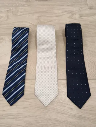 Set cravatte da uomo sui toni del blu e del bianco. Marchi: Project, Caporiccio, Eddicott. Quella più scura è lavorata a mano e decorata con piccoli rombi a contrasto che tendono a sfilacciarsi. Vendibili anche separatamente.