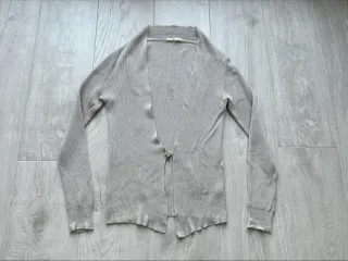 Cardigan nuovo color nocciola con chiusura a zip, made in Italy. 75% lana, lavorazione a coste verticali con colletto. La taglia indicata sull'etichetta è una 4 (dovrebbe corrispondere a una L, misure in foto).