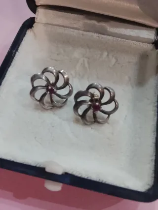 Deliziosi orecchini a forma di fiore, realizzati in argento e impreziositi da un piccolo rubino al centro. - Design floreale unico. - Dettaglio centrale in rubino.