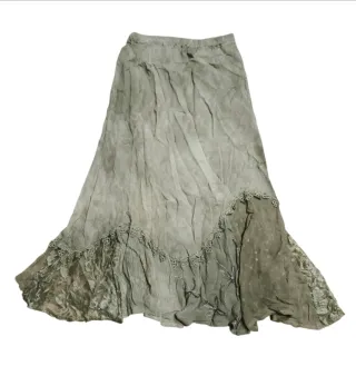 Bellissima gonna lunga vintage in una sfumatura di verde oliva. Il design presenta un'onda di pizzo e dettagli ricamati sul fondo, che aggiungono un tocco bohémien ed elegante. - Lunghezza maxi. - Dettagli in pizzo. - Ricami floreali e paillettes.
