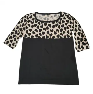 Maglietta da donna con un design a fantasia di cuori sulla parte superiore e maniche. - Fantasia cuori su sfondo beige. - Parte inferiore e maniche a tinta unita nera. - Scollo rotondo.