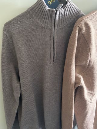Due maglioni da uomo con collo alto e zip. - Un maglione grigio. - Un maglione marrone.