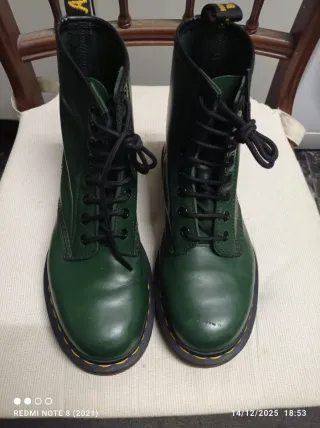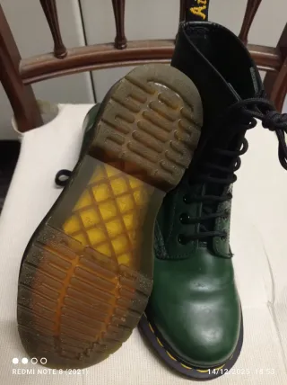 Iconici stivali Dr. Martens in un elegante colore verde. Perfetti per aggiungere un tocco di stile unico al tuo guardaroba. - Modello stringato. - Cuciture a vista gialle sulla suola. - Linguetta posteriore con logo AirWair. Dottor Martens numero 41, usati qualche volta. Presentano qualche micro graffio, e piccolo difetto d’usura sulla parte dietro dello stivale sinistro (vedi foto). Stringhe e interno dello stivale in ottimo stato. Suola ok.
