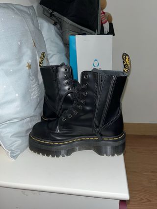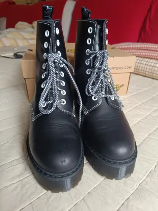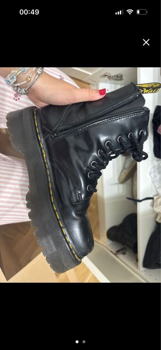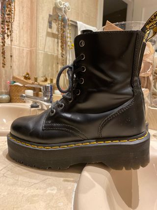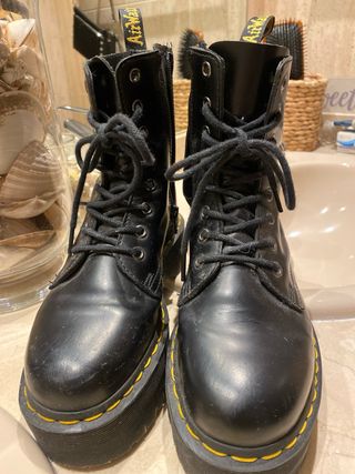 Iconiche Dr. Martens con suola platform.usate solo poche volte perché ho sbagliato.numero.con qualche segno leggero.sulla parte davanti come si.vede in foto vendo a 99 euro - Modello con lacci. - Dettaglio con cuciture gialle. - Zip laterale per facilitare l'indosso.