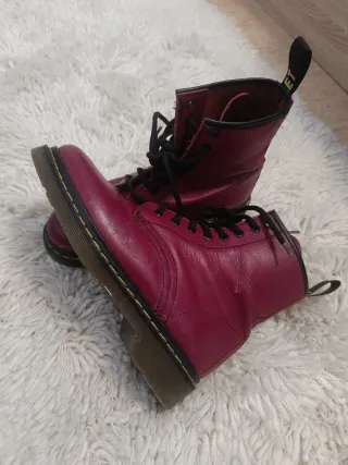 Stivali iconici in pelle color bordeaux. Design classico a 8 occhielli. Suola con distintiva cucitura gialla. Tirante posteriore con logo. La scatola è un po' danneggiata per il trasloco, ma è originale. Lacci originali. Su una delle scarpe ci sono resti di un cuscinetto posteriore che ho messo per provare a indossarle. Indossate un paio di volte.