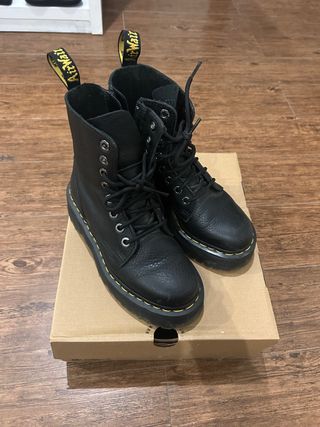 Stivali Dr. Martens Jadon con lacci gialli e cordino nero. Usati poche volte (vedere le foto di tutti i dettagli). Di solito indosso una 37 ma nelle scarpe una 38 (lunghezza suola 240mm). Senza scatola. Design con piattaforma. Dettaglio di cuciture gialle. Tirante posteriore con logo.