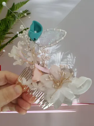 Bellissima acconciatura decorata con fiori e perline, perfetta per completare un look elegante. - Pettinino integrato per un facile fissaggio. - Dettagli floreali in tessuto. - 2 rose in raso, una in organza e altre che vanno a completare la composizione. - Perline decorative sparse. Foglia glitterata in verde e azzurro.
