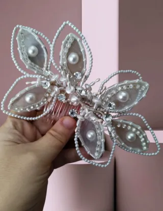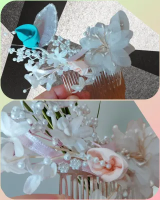 Splendida acconciatura per capelli, perfetta per un matrimonio o un'occasione speciale. Realizzata con cura artigianale, aggiunge un tocco di eleganza e luminosità. - Design floreale con perle e strass. - Finiture in filo argentato. - Pettine integrato per un facile fissaggio.