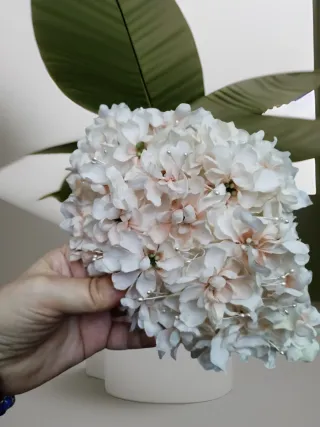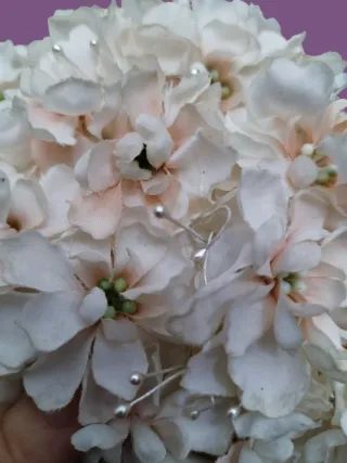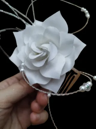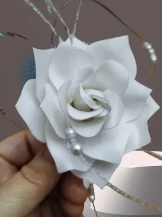 Bellissima rosa decorativa, ideale come accessorio per capelli o per decorazioni. - Fiori in tessuto bianco. - Dettagli con perline e fili decorativi.