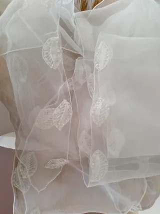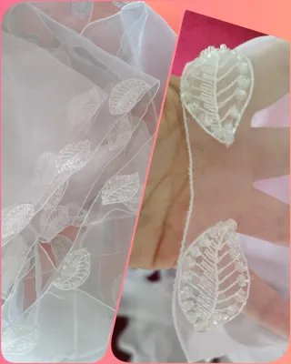 Bellissima passamaneria in organza con un delicato motivo a foglie. - Motivo a foglie ricamato. - Dettagli con perline. - Tessuto leggero e trasparente. Passamaneria adatta al riciclo. Presenta imperfezioni, ma le foglie sono intatte. Adatto a chi deve fare lavori creativi e può modificare li dove si presentano le imperfezioni del tessuto. 6 metri, altezza 20 cm, organza. Bianco ottico