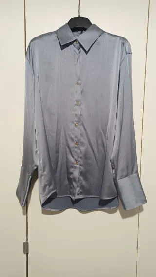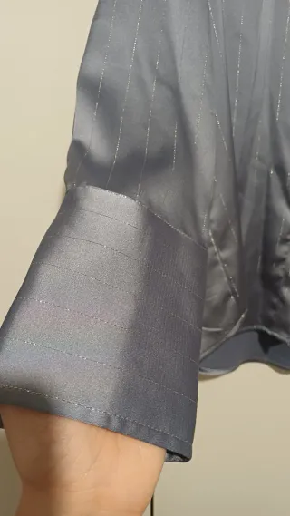 Camicia da donna dal taglio elegante, perfetta per completare un look sofisticato. - Tessuto setoso con sottili righe argentate. - Colletto classico e chiusura con bottoni. - Polsini ampi e definiti. 👕mai indossata Marca LUMINA Taglia UNICA 🚚Spedisco veloce