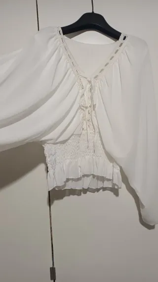 Camicia bianca con dettagli in pizzo e fiocco. - Maniche lunghe a sbuffo. - Elastico in vita. - Scollo a V con laccetti.