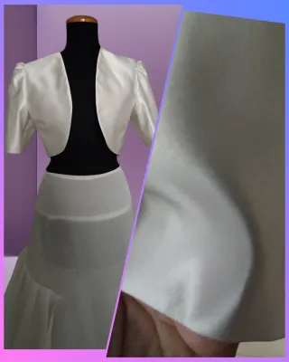Elegante giacchino in raso bianco, perfetto per completare un outfit. - Tessuto liscio e lucido. - Maniche corte a sbuffo. - Scollo arrotondato aperto. Lunghezza spalle 37, altezza 35