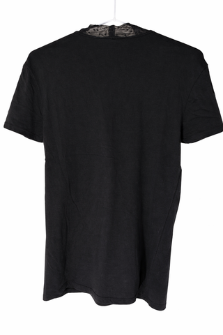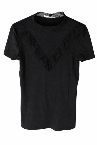 Maglia donna Terranova taglia L colore nero. Con dettaglio in pizzo trasparente e volant frontale. Buone condizioni, nessun difetto. Perfetta per outfit casual o serale.