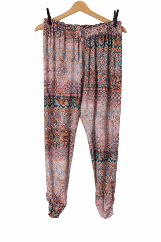 Pantaloni donna TeléPathe taglia 46 con fantasia etnica multicolore. Vita elastica con laccio regolabile e tessuto leggero molto comodo. Ideali per estate, vacanze o outfit casual boho. Condizioni molto buone come da foto. Spedizione disponibile.