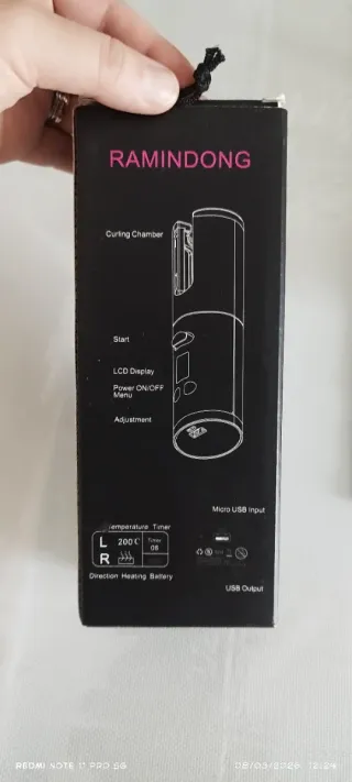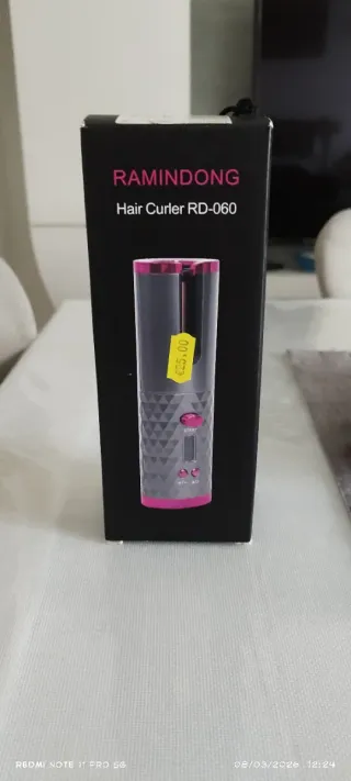 Arricciacapelli automatico RAMINDONG modello RD-060. Design moderno con finiture rosa. - Carica tramite USB. - Etichetta con prezzo €25,00.