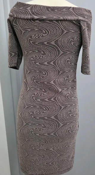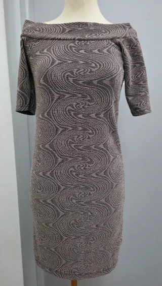 Elegante abito con fantasia geometrica. - Scollo Bardot. - Maniche corte. - Tessuto leggermente scintillante. Compra più articoli e sarai sconti