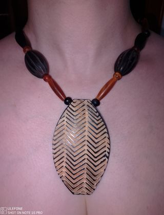 Collana da donna con un design etnico e originale. - Ciondolo a forma di foglia con incisioni. - Perline in diverse tonalità di marrone e nero. - Stile unico e artigianale.