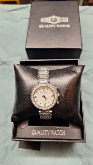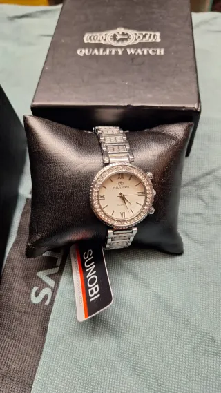 Elegante orologio da polso da donna. - Cassa rotonda con dettagli luminosi. - Cinturino bicolore in metallo. - Quadrante con indici romani e lancette sottili.