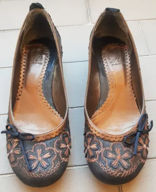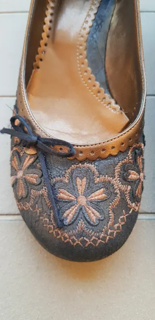 Eleganti ballerine con un design floreale ricamato. - Dettagli floreali color bronzo - Fiocco decorativo sulla punta. - Finitura con bordo smerlato.