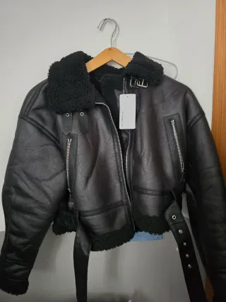 Giacchetto corto in ecopelle nera, perfetto per un look audace. Taglia m/44 italiana nuovo con cartellino. - Collo in pelliccia sintetica nera. - Chiusura con zip frontale. - Dettagli con zip sulle tasche. - Cintura in vita con fibbia.