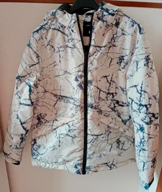 Piumino con cappuccio dal design unico. - Fantasia effetto marmo blu e bianco. - Chiusura con zip frontale. - Cappuccio integrato.