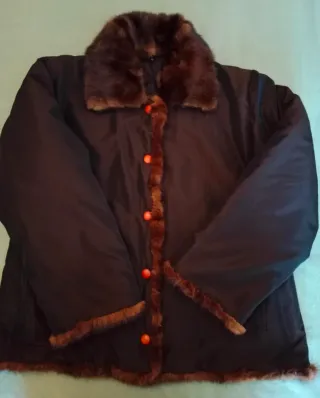 Elegante giacca da donna con dettagli in pelliccia. Taglia 48 italiana - Finiture in pelliccia marrone. - Bottoni a vista color arancio. - Collo in pelliccia.