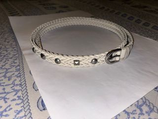 Cintura a Doppio Giro(è lunga abbastanza per fare 2 giri)Come Nuova Ma è Vintage(circa della Fine Anni ‘90/inizi anni 2000),CINTURA MISURA REGOLABILE,Originale Marca:”TANK” Made in Italy,DA DONNA/RAGAZZA,in vera pelle bianca intrecciata,con borchie solo davanti su 1 dei 2 giri argento opaco in 2 forme(cerchi e quadrati)L’unico piccolissimo difetto si vede nell’ultima foto 1 piega sulla punta della cintura ma solo all’interno della cintura per il resto è COME NUOVA,LA CINTURA NON HA I BUCHI/FORI PERCHÉ SI CHIUDE TRA UN INTRECCIO E L’ALTRO DELLA CINTURA Misure lunghezza totale cintura:200 cm altezza cintura:2,3 cm €15 non trattabili