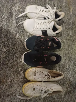 Diverse paia di scarpe da donna. - Scarpe bianche con dettagli neri. - Scarpe sportive nere con dettagli rosa. - Scarpe bianche usate con suola gialla.