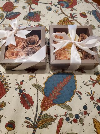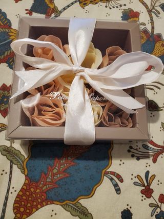Set di petali di sapone a forma di fiori, perfetti per decorare o per un regalo. - Confezione regalo con nastro. - Fiori in tonalità beige e marrone.