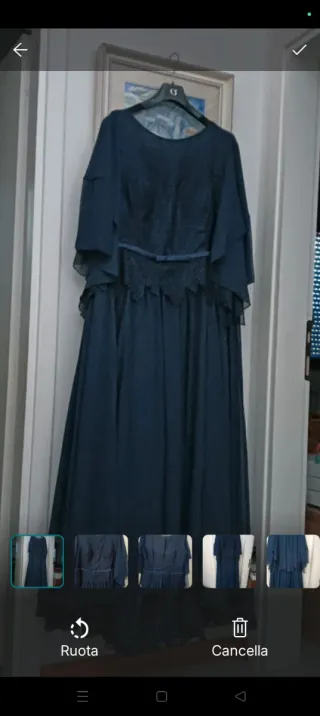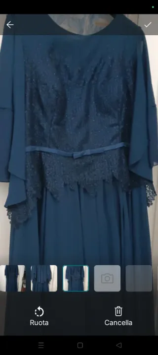Elegante abito blu, perfetto per cerimonie. - Tessuto leggero e fluido. - Dettagli in pizzo sul corpetto. - Cintura in vita. - Maniche a campana.