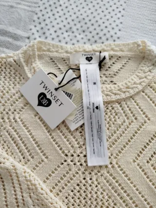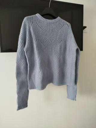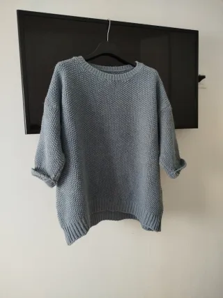 Maglioncino lavorato a maglia con un bel colore carta da zucchero. Taglia più o meno M/L - Tessuto morbido e confortevole. - Maniche a 3/4 - Scollo rotondo.