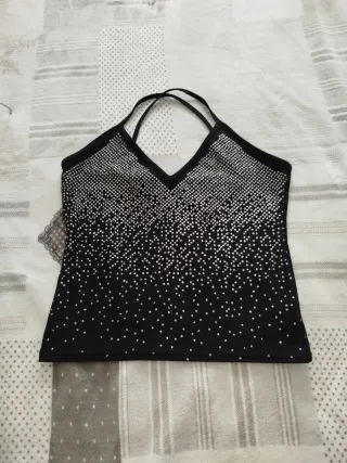 Top con un design elegante e scintillante, perfetto per aggiungere un tocco di glamour. - Scollo a V. - Decorazione con strass. - Spalline sottili.